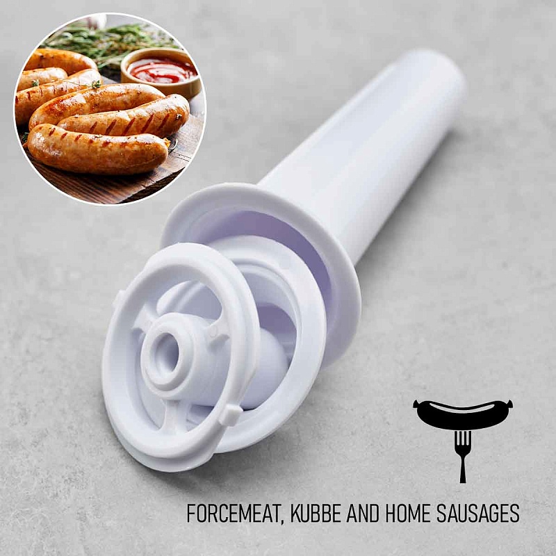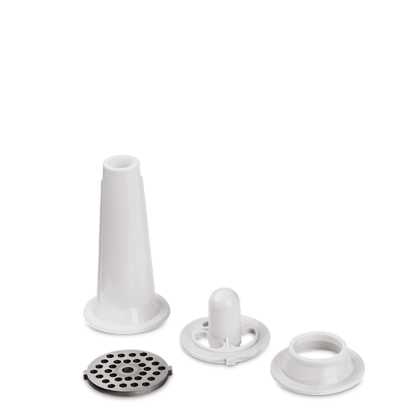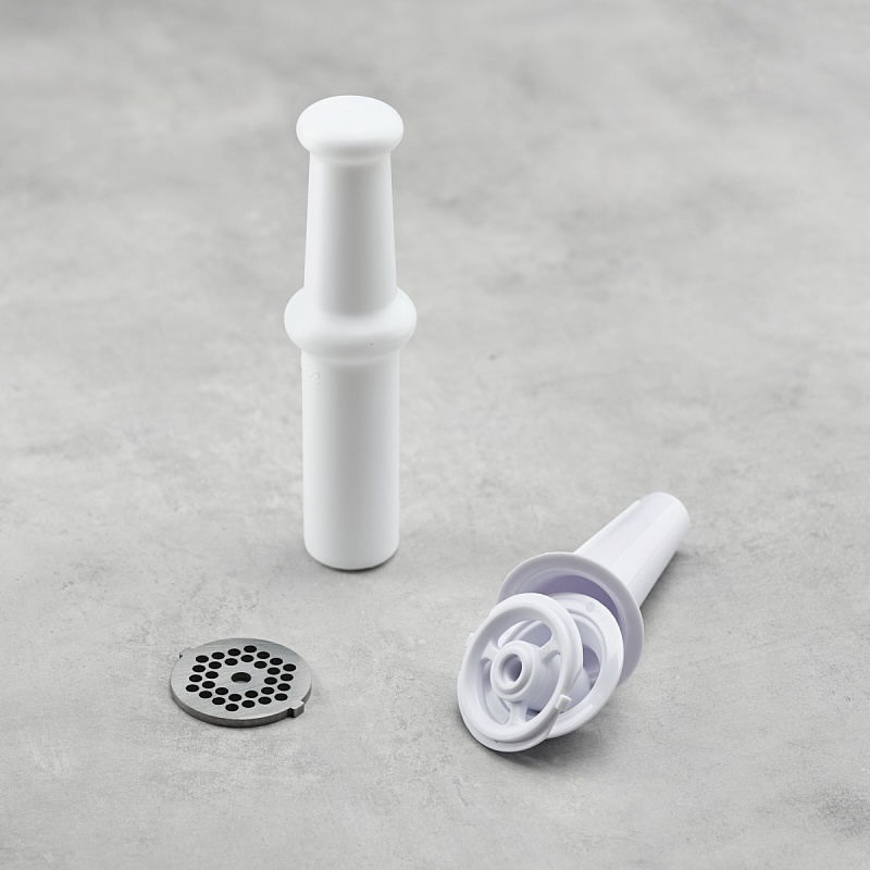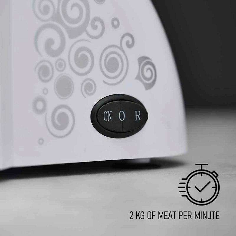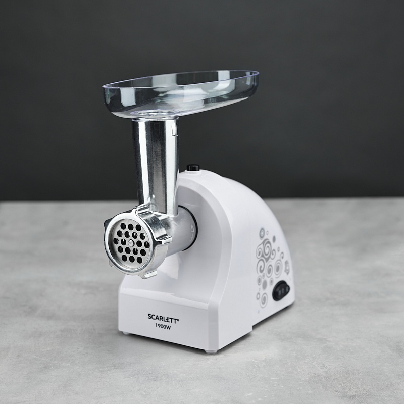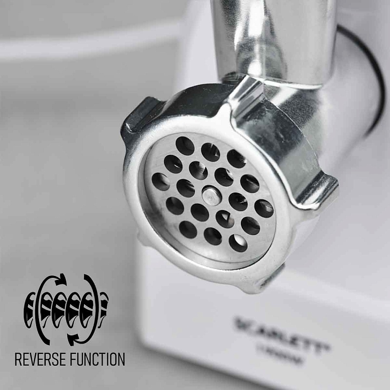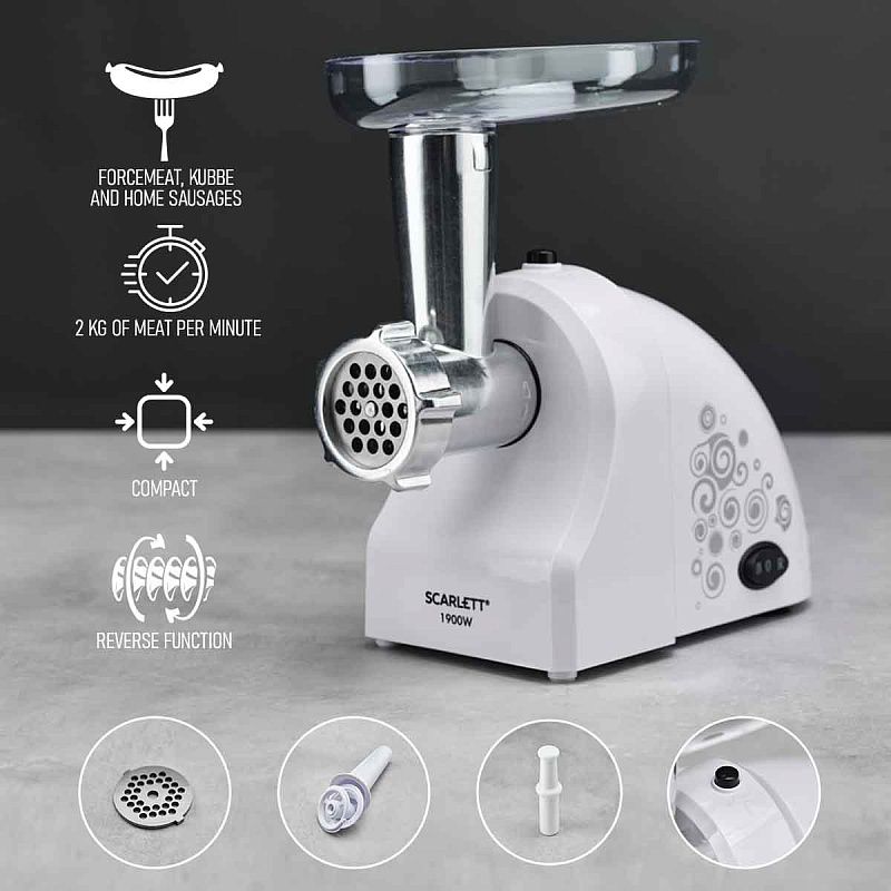 Compact and powerful meat grinder SC-MG45S52 is a reliable assistant in your kitchen. High power of meat grinder motor allows you to mince any kind of meat into a homogeneous mass, and the performance of the model reaches 2 kg/min. The kit comes with 4 attachments: 2 perforated discs with 5 and 7 mm holes, attachments for kebbe and homemade sausages. High-strength metal screw and knife made of high-quality stainless steel feature improved wear resistance, thereby increasing the efficiency and extending the service life of the device. SAFE PRO technology helps to prevent engine overheating and overload, thereby extending its service life. Reverse function lets you mince the meat in the backward direction, if it gets stuck. Rubber-coated legs significantly facilitate the cooking process and make the device to be stable on the surfaces with different coatings. The disassembling of the meat grinder takes minimal time: just press the button to detach the neck and separate all the metal parts from each other. This model perfectly combines the compact size and light weight of the meat grinder. Stylish design of SC-MG45S52 meat grinder is perfect for your kitchen.