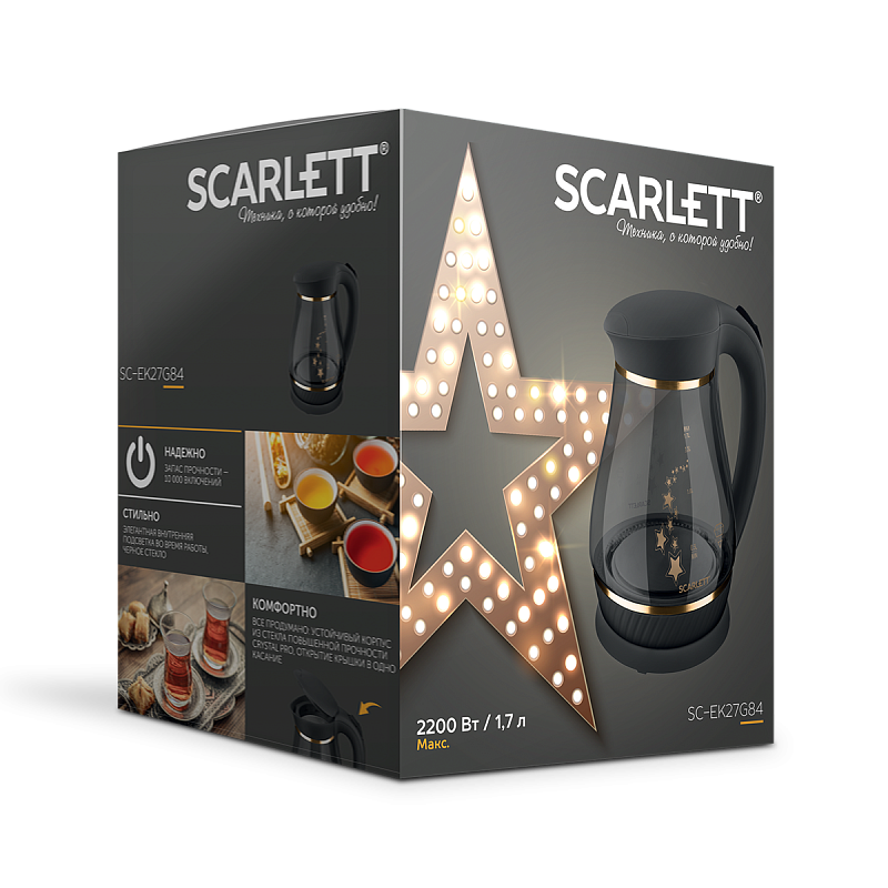 Electric kettle SC-EK27G84 with 1.7 L volume. The embedded heating element keep a long service life of the kettle. Automatic lid opening - comfortable to use. Safe Work multilevel system – boil dry protection – will make the operation of the appliance more safe! Internal lighting will turn the process of boiling water into something fascinating! A stlysh combination of black glass and gold colors will be a stylish solution in the kitchen!